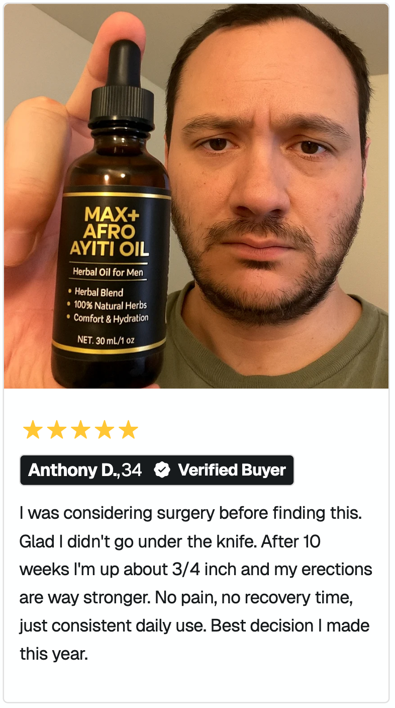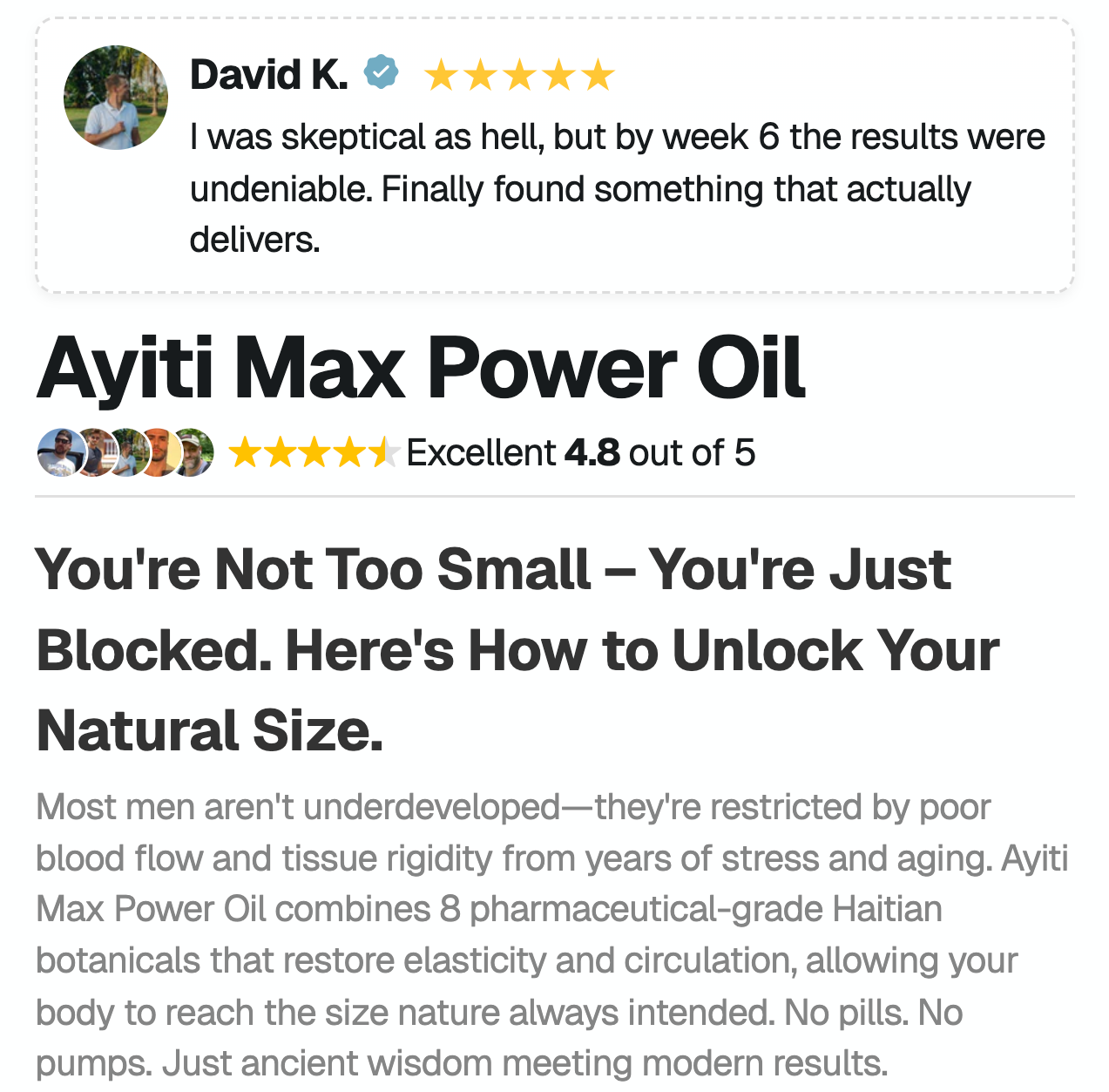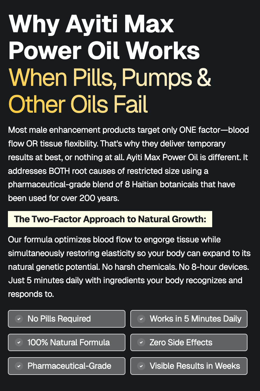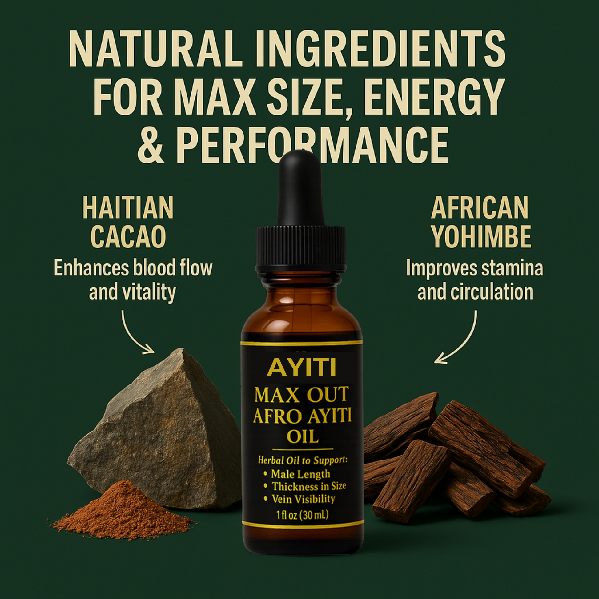 Ayiti Max Power Oil is a 100% natural topical formula that combines 8 pharmaceutical-grade Haitian botanicals to address the two root causes of restricted size: poor blood flow and rigid tissue.
