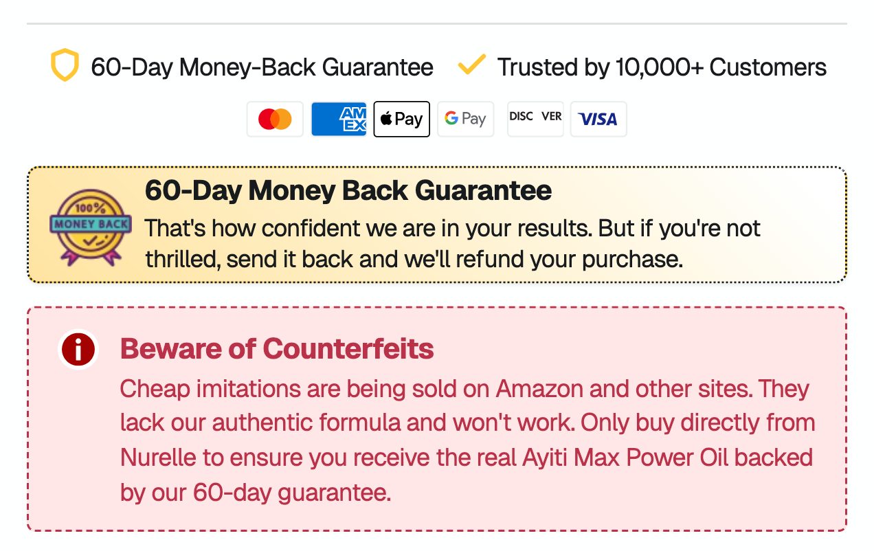 We offer a no-questions-asked 60-day money-back guarantee. If you're not satisfied with your results after using Ayiti Max Power Oil as directed for at least 6-8 weeks, simply contact us for a full refund. We'll even let you keep the bottle. We're confident this works—and we're willing to take all the risk so you don't have to.