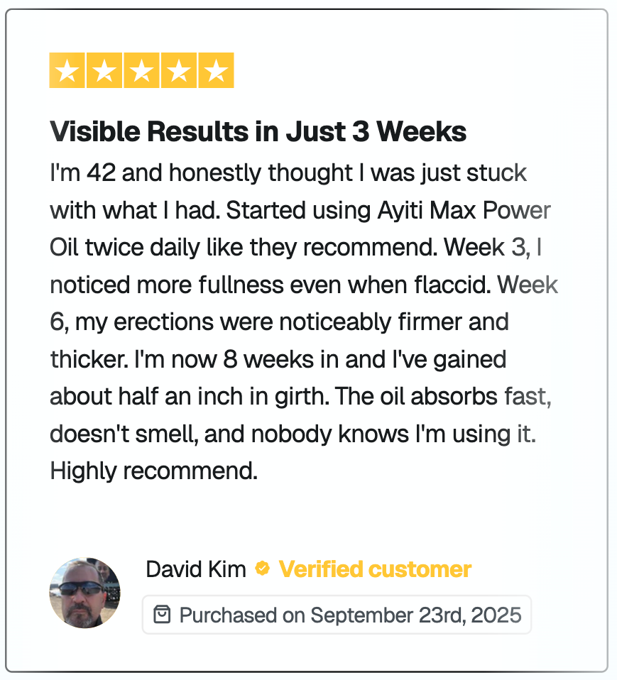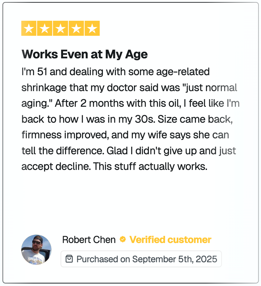 Simple: Apply 3-5 drops to your entire shaft (flaccid or semi-erect), massage gently for 2-3 minutes using upward strokes, then perform optional light stretches for 1-2 minutes. Use twice daily—once in the morning and once before bed. The oil absorbs quickly with no greasy residue. Full instructions and our "5-Minute Growth Protocol" guide are included with every order.