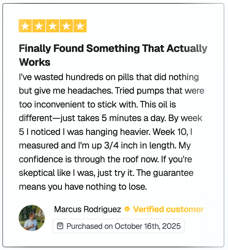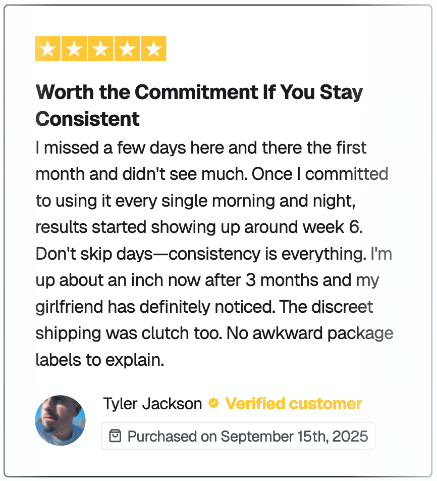 Important: This is NOT a magic pill. Like any natural growth process, results require consistency. Most men report their biggest gains between weeks 6-12 with twice-daily application.