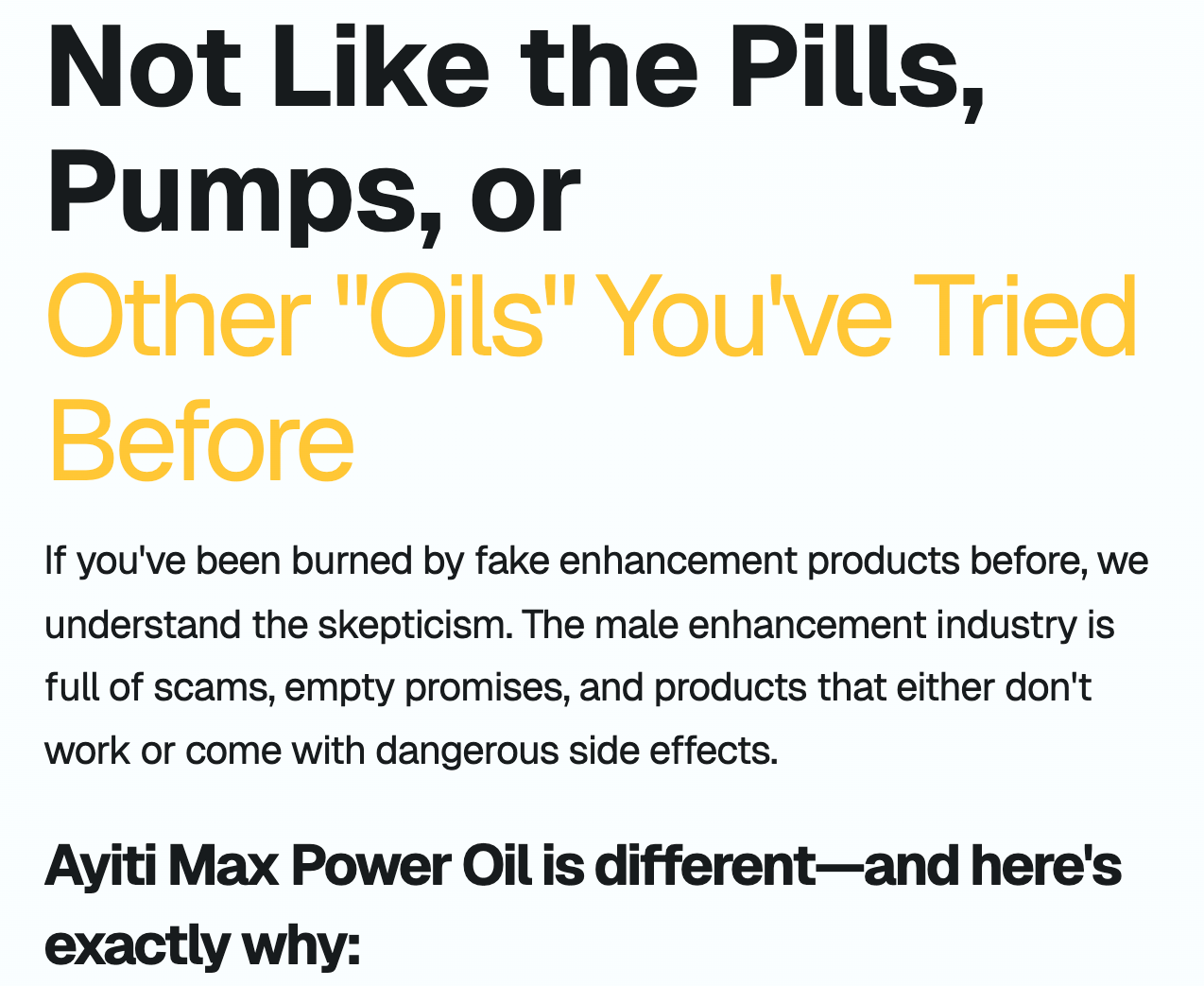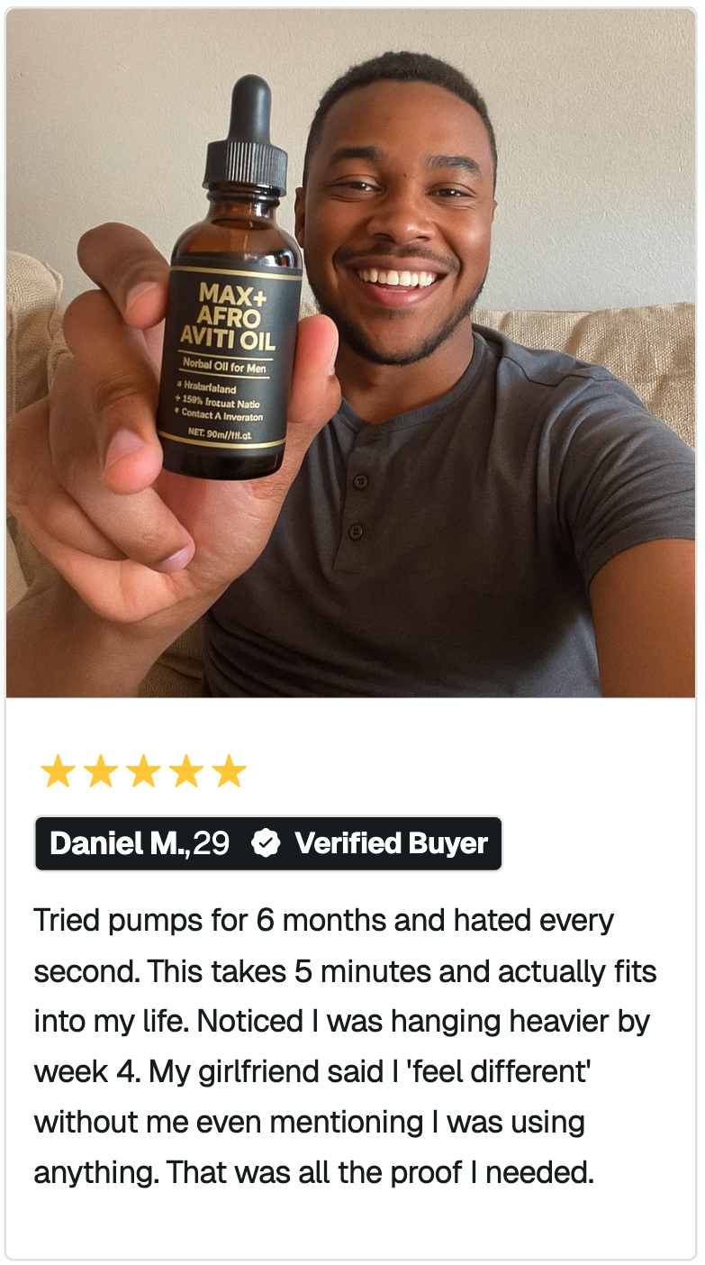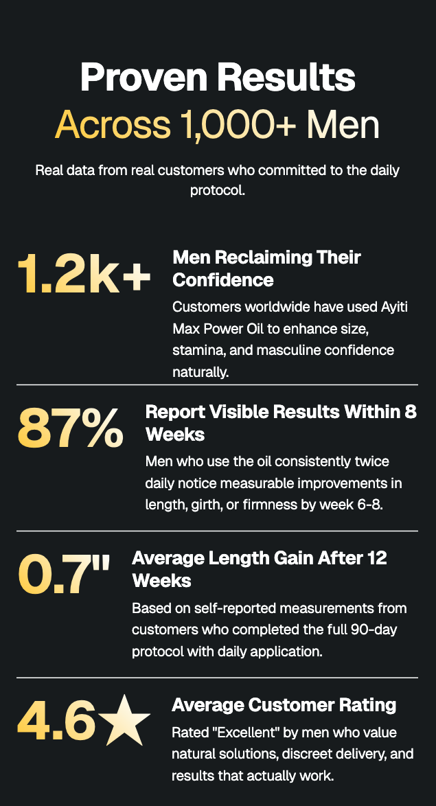 Ayiti Max Power Oil is 100% natural and safe for external use. Unlike oral pills that can cause headaches, jitters, or blood pressure issues, our topical formula never enters your bloodstream. All ingredients are pharmaceutical-grade botanicals with no synthetic chemicals or hidden drugs. Mild warmth or tingling during application is normal (it means blood flow is increasing). Allergic reactions are extremely rare. If you have sensitive skin, do a small patch test first.