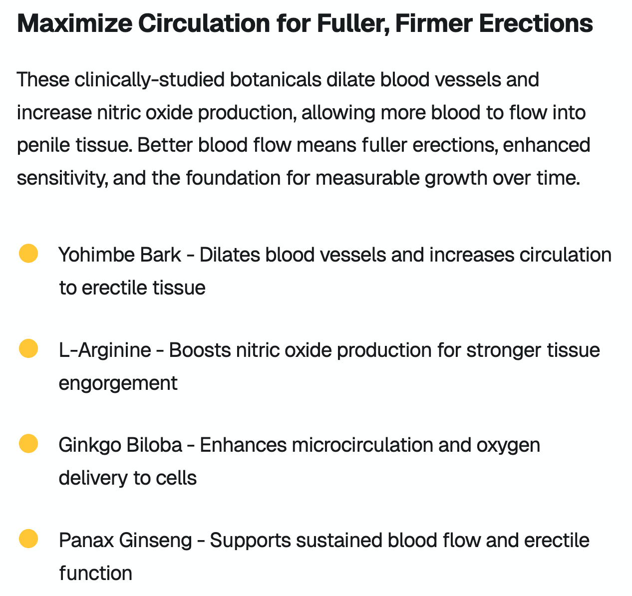 1. Blood Flow Optimization – Ingredients like Yohimbe Bark, L-Arginine, and Ginkgo Biloba dilate blood vessels and increase circulation to penile tissue, creating fuller, firmer erections.