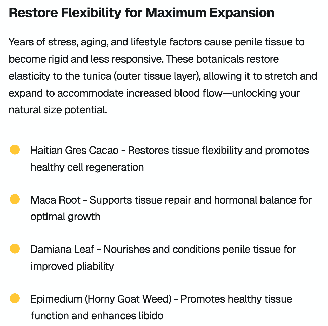 2. Tissue Elasticity Restoration – Haitian Gres Cacao, Maca Root, and Damiana Leaf restore flexibility to the tunica (outer tissue layer), allowing it to expand to its natural genetic potential.