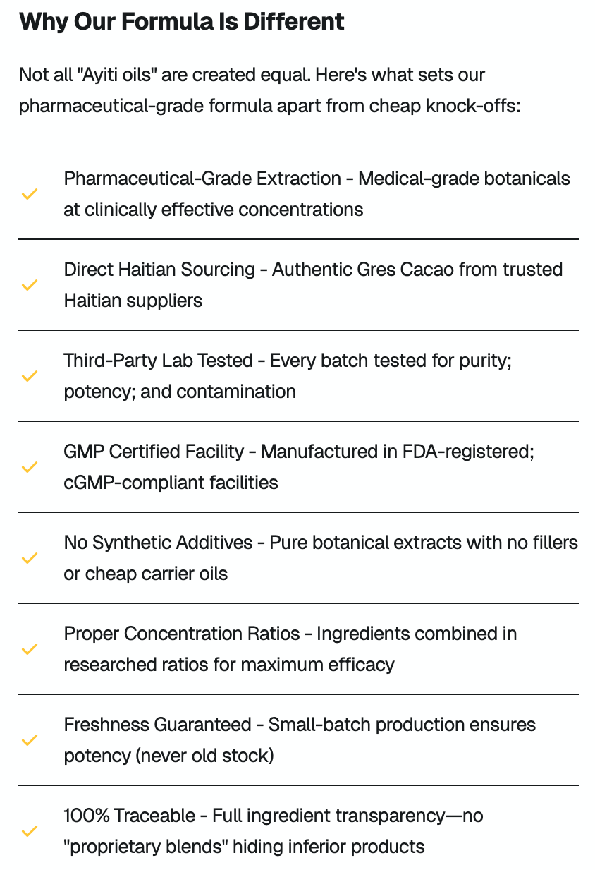 Many "Ayiti oils" or "Haitian oils" on Amazon and third-party sites are diluted, contaminated, or completely fake. They use inferior ingredients at concentrations too weak to produce results.